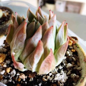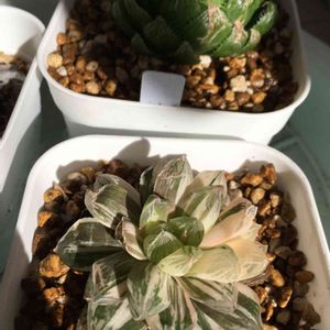 おかあさんハオルチアから外した子株ちゃんたち 根っこもなかなかでず数ヶ月。。 お外管理していたが、寒くなりどんどん弱っていく一方。。色もどす黒く。。 やば。。。このまま、お星様に。。 と諦めかけた心の中、根っこなしで外は無理だなと小さい豆鉢にそれぞれいたのをとりあえず集合してみました すると、なんとか根っこそれぞれ少しずつ出してくれていました♡ ならばと、ダメ元で腰水管理♡ するとどうでしょう✨✨みるみるキラキラと明るく中心が輝いてきました♡♡♡ ってごめん!水が足りてなかったんだね!!