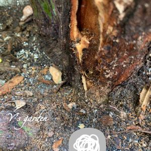 パレードの根元。 カミキリムシのかじったあとだと思われます😭 半分くらい欠けたかな 復活を祈ります😞 根元にあったおがくず状のカスは 新たには出てきませんでした。 殺虫剤を注入したりまいたりして 様子見です