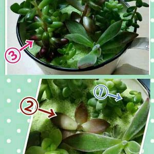 昨日の夜、子持ち蓮花と一緒にチョンパしました! 真ん中②の子は切って写真を撮ったあと、取れてしまったので写真と見た目が変わってしまいました(;´д`) 早く芽が出てくるといいなー。 葉挿しにしたのもちゃんと出てくるといいなー。