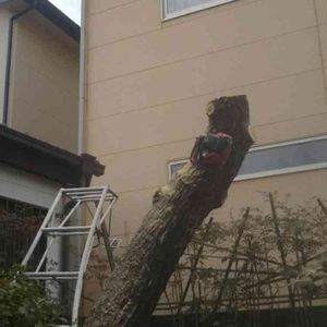 本日の作業!松くいで枯死した大きい松の伐採作業! 2階以上の高さがありました! 上から順番にロープを使いながらやっとここまできましたよ! 手順が分かってなければ 危ない⚠🚫⚠!( ¨̮ )💕