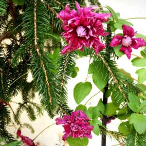 家のシンボルツリーのシマトネリコにクレマチスのパープレア・プレナ・エレガンスを絡ませています。暗赤紫の花色で小輪で万重咲き。蔓はぐんぐん伸びもう少しでシマトネリコに追いつきそうです♫