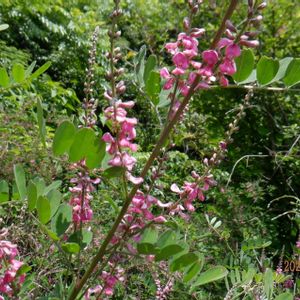 里山散歩をしていると 涼しげに咲く マメ科の樹木をみつけました 樹高3mはあるので コマツナギではなく "トウコマツナギ"ではないでしょうか 葉腋に長さ10cmほどの総状花序を伸ばし 淡紅紫色で長さ5mmほどの蝶形花をつけています 花序の下から上に咲いていっています 二枚目 咲き始めは 雄しべと雌しべは竜骨弁の中にありますが 雄しべと雌しべが出てくると竜骨弁と翼弁は落ちていき 旗弁のみになってしまいます(松江の花図鑑より)