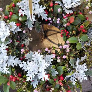 今日のお花♡ シロタエギクを入れて*(まるっぽい葉っぱのとこだけど) 庭の花でアレンジ♪ カルーナとハボタン プラチーナで 主役を引き立てる*