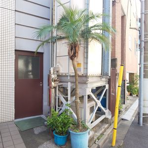 東京は森下で。 宿泊場の近くで見付けたシンノウヤシ🌴 全く痛み無しの完璧過ぎる程の越冬状態です。 小さい鉢なのに葉が長くて調子良さそうです。