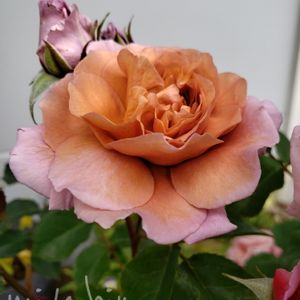 空蝉(うつせみ) 写真じゃ分かりづらいんですが、クラシックなサーモンピンクみたいな珍しい色をしてます。咲き始めはもっとオレンジの色が濃いみたい。波状の花弁が特徴的。 四季咲き/中輪/フロリバンダ/強香