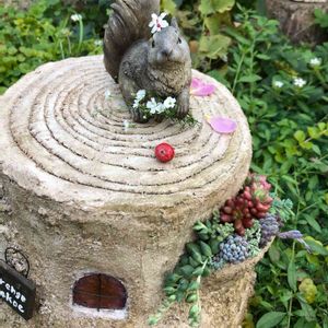 庭の切り株に リスが🍂木の実を探しに🐿 可愛いお花を身にまとい✨ 可愛いリスが切り株へ モルタルデコ作品 切り株 お庭にそっとあったら 可愛いですよね🌵🎶