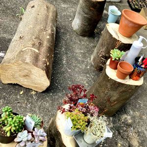 先週主人が裏山の木を切ったので、切り株集めて私の園芸台✨ 切り株の鉢なんかもしてみたいな💕