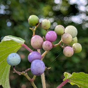 💎野に輝く宝石 ノブドウの実💎 郵便局まで歩いて行く途中 ちょっと遠回りをして ひと月前に、水面を覆い尽くすようにホテイアオイが咲いていた池に寄ってみた🚶♀… 池の周りには、 綿毛になったセイタカアワダチソウ ひっつき虫のコセンダングサ がい〜っぱい♪♪♪ その中に、美しく輝くノブドウの実💎✨✨✨ 寄り道して良かった〜🥰🎶