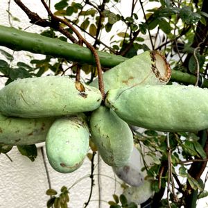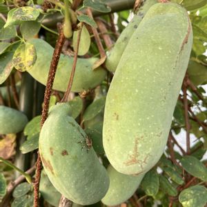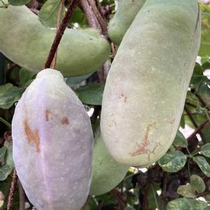 同じ棚にアケビとミツバアケビ? 三つ葉と象虫?