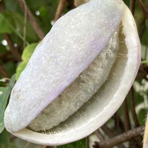 おはようございます🙋♀️ アケビの実 アケビ科 つる性の落葉低木 大きな楕円形の実が大きく割れ中からゼリー状の種が見えます🤪 食べた事はありません お花は4~5月頃に見られます💠 樹木の「つる」を使った工芸品の籠バックはとても高価で素敵ですよね😃 右側過去pic 左側9/26撮影 向島百花園にて