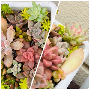 初めての寄せ植えを作ってから2ヶ月ほどですが、その間にも順調に(?)多肉が増えているので新たな寄せ植えを作りました☺️ 写真では分かりにくいですが、手のひらサイズの小さなものです。 先日お迎えしたオーロラが今一番のツボです😍 右側のピンクっぽいような紫色っぽいような肉厚の子は誰だか分からず… 分かる方いましたら教えてください〜