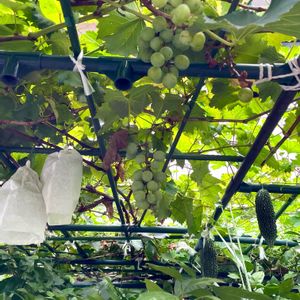 春先に花穂がほぼなくて収穫諦めたブドウたちなんですが😓その後副梢から花穂が出てなんといくつも実になりました😃でも開花そろわないし、面倒くさくてジベ処理はせず、摘粒もせず😅たまにバラの消毒ついでにあまった消毒液を撒いただけ💦それでもここまで育った✨春に花が咲いて実になったものはほぼカラスの餌食😑なんとかネットかけて守りたいけど只今もネットは🍉で使用中😐間に合うかな💦ここまできたらやっぱり収穫して食べたいよ😄