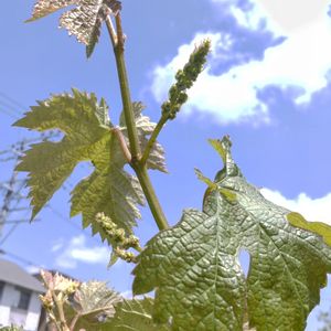 (2023年5月18日 14:58頃 撮影:Galaxy A21) 確か、今年で四年目になるんじゃないかなと思う巨峰。 半額で買ってきて食べて、種を植えて。 芽が出ないからあ~出ないんだ。やっぱり難しいわなって思ってほったらかしてたら、ある日芽が出て、雑草に見えないので正体不明だなと思いつつ、そのまま一緒に世話してて、試しに葉っぱをむしって食べたらぶどうの皮の味がして種を植えたのを思い出したと。それから株の大きさに合わせて植え替えて行って。気づけば4年。 冬になったら枯れたみたいになるので短く剪定して、暖かい日だけ水遣りしてとりあえず暖かくなったらこうなると。 ツルが毎年暴走するので、行灯仕立てにしたい私は丸いヤツに飛び出したツルを誘導して巻き付かせてる感じ。
