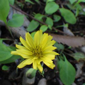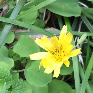 シダの間からチッチャイ黄色の花🌼 コウゾリナ?カナ?細長い葉でしたよ😊 7mm位の可愛い野草