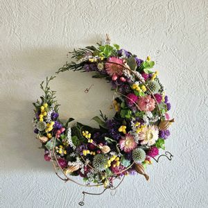 こんばんわ😃 知り合いからの依頼で作製したドライフラワーリースです🌼 年末にお渡ししたのを見せてもらいましたが脱色もほとんどなく良い感じで飾ってもらえてます😆