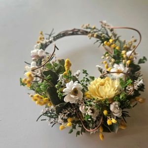 春の定番花として定着したミモザに、白い小花がかわいらしいハナカンザシ、黄色のカイザイクを合わせた手のひらサイズのミニリースです🌼 サンキライのベースはラフに編み直しております。 今日は冬の寒さが戻ったような天気ですね。 体調に気をつけて過ごしましょう。。。
