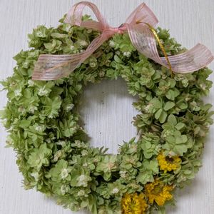 ローダンセマムとヘリクリサムのドライリース 繊細な雰囲気がドライフラワーらしい2種のお花をメインにした、春らしいアレンジメントに仕上げました。 プリザーブドグリーンは明るい色合いを使用して、リースが軽やかな雰囲気になるようにしております🌼