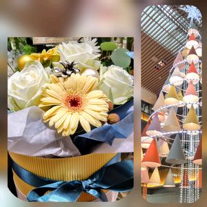 街角散歩🎵3 駅前キッテのクリスマス🎄ツリーは、傘の中に電球が〜 省エネで〜素敵でした💞 デパ地下花屋さんの沢山の中から 🟡ガーベラ✡🔵リボン 誰の元に行くのかな♡♥♡