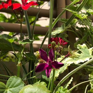 真紅のゼラニウム♥カリオペダークレッド。 一年中咲いているような感じでしたが、厳しい夏は葉が白化して調子を崩します。 今年は挿し穂がうまく育ったので(右下)親株は思い切って切り戻しました!裸同然です😝 こんもりと咲くようになるのは初夏でしょうか。 我が家のビタミンフラワーです。