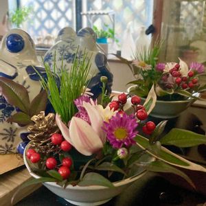 お正月用の🎍 ミニチュア生花を いただきました 14センチ程の器に生けてあります 高さは10センチ位で 器はお茶碗です 玄関に飾りました😁🎶