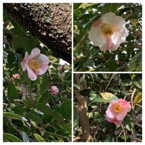 2023,1,2 15:01撮影 朝散歩の時は気づかなかったが昼出かけた時一本の椿の木にたくさんの花が咲いてた。 いつもは2月頃に咲くけどこんなに早く咲くのは初めて。 開花期11月から3月の早咲き椿 昭和侘助、別名初雁 侘助は花粉が作られないので葯の部分が白い。