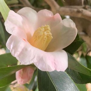 こんにちは😃 早咲きの美しい椿です。 花の姿から昭和侘助、別名初雁と呼ばれる侘助椿と思われます。🤔 しかし、シベ筒を見ると雄しべの先に葯のようなものが見えます。 もしかしたら、別の椿かもしれません。 侘助椿は有楽と呼ばれる椿の子孫で、小輪、猪口咲き、葯の退化が特徴です。 とても気品があって、美しい椿なので、間違えていたら正しい名前が知りたいです。🤔