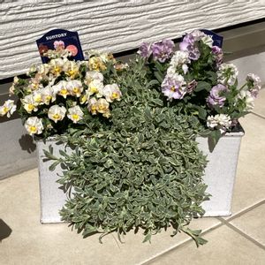 こんばんは😊 今日のパンビオは サントリーフラワーズさんのミルフル💖 なんか真ん中に植えたシレネユニフローラの存在感がありすぎですが😆 アンティークの方が今はモリモリしてきてます💕 花がら取ってると茎ごと取ってしまい不恰好になりがちなのはわたしだけでしょうか🤣