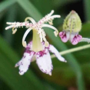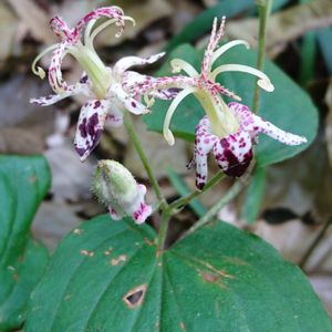 ★ どうぶつシリーズ ヤマホトトギス 山杜鵑草 こちらは 植物園で 大切に育てられていて、名札が付いていたので 間違いなく ヤマホトトギス。 北海道南西部〜九州に分布。山野の林内に生える高さ40〜70cmの多年草。 茎の先端で花茎が枝分かれして伸び、花びらが反り返って咲くのが 特徴だそう。 花びらの 紫色の斑点が多いホトトギスに比べ 斑点は少ないそうです。
