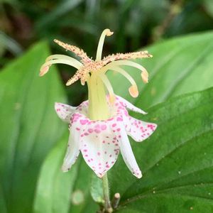 ヤマホトトギス🌸ピンクのポチポチが 可愛い💕 ユリ科ホトトギス属 多年草 白い花弁に紫色の斑点が入って反り返って開きます。 6枚の花びらの中心から柱頭が立ち上がっていて、先端に雌しべが3つに分かれその先は2つに分かれてます 6本の雄しべは雌しべの下に広がってます