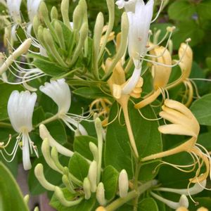 スイカズラ 白と黄色が綺麗✨ 大きい鉢にしたら沢山の花が咲きました💛🤍