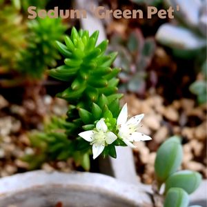 フェイクみたいだけどリアル・多肉ちゃんです。セダム・グリーンペットさん。とっぺんのポッチリ紅葉とねじねじスタイルが可愛い😊