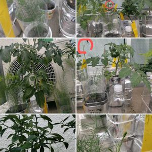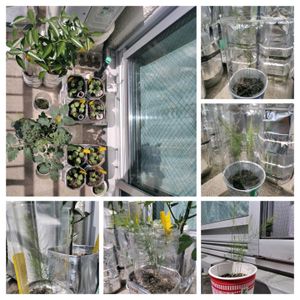 2025/5/3(土) アスパラ 右側:じゃがいもカップからペットボトルへ植え替え。 根が回っていないので、途中崩れたり倒れたり。 左上:植え替え後。茎が倒れかけ。 左下1リットルペットボトルでカバー作成。 この後、他の鉢にもカバーを設置。 強風と猫のかじり対策。