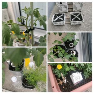 2025/5/25(日) 細々メンテナンス。 右上:バジル種蒔き。植え替え用に仕切りをつけてみた。 右中・右下:植え付け予定の鉢には、牛乳パックを差し込んで植え付けスペース確保。 左上:添え木設置。伸ばしている脇芽にマーク追加。 左下:差し込み式の虫取りシートを使えない鉢には、側面に虫取りシート設置。