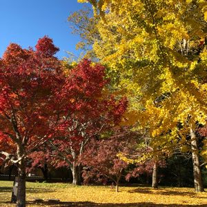 近水園の紅葉🍁 青い空に赤や黄色がとても綺麗 どこを切り取っても 絵になるなぁ。 こんな景色が見られるなんて ほんと幸せだね❤️
