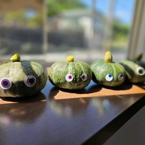 こんにちは~❣️ またまた久々の投稿。 今日は職場の保育所の畑で収穫した カボチャ🎃 可愛くお目目を付けてもらったので 📸 もう、2個は煮物にしたりドーナツにしたりお腹のなか。 今週末は三連休 多肉の植え替えでも始めようかな~。 徒長しまくりよ~🤣