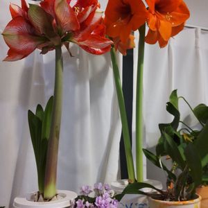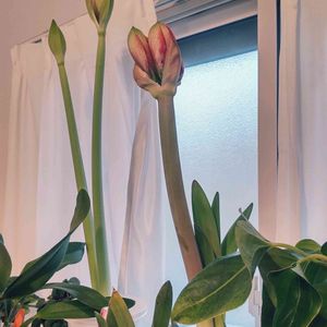 窓辺が渋滞しているー😅 アマリリスが咲きそう😍 めっちゃ長く伸びたけど倒れへんかな😱