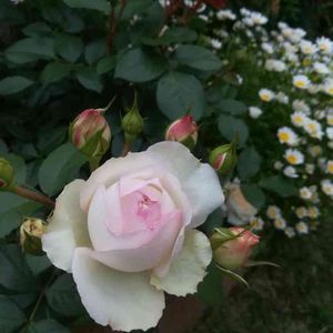 ブルームーンとステファニーさん。 コガネムシや小さい虫達の恰好の餌食になり変色したり穴だらけだったり…^_^; しかしブルームーンの花付きの良さにビックリしてます。