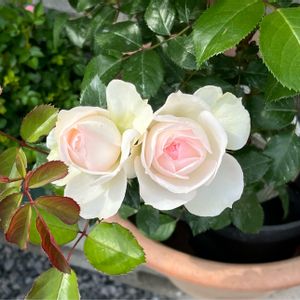 🌹バラ🌹 ステファニーグッテンベルク ベランダで夏中元気に咲いていたバラです🌹 アイボリーの花弁の中がピンクに染まります💓