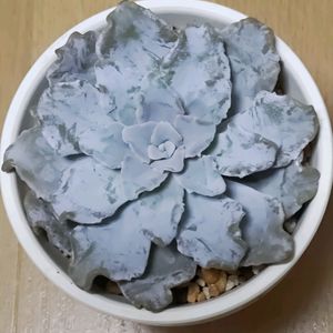 初めてのエケベリアをお迎えしました🪴 大株の白いブルームとフリルが美しかったので子株をお迎えしてみました😊 友達作のぐい呑みに穴を空けて植え込み🌱 エケベリア・クリスペートビューティー🌸