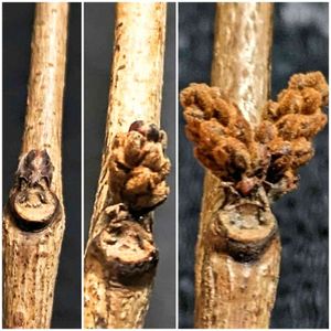 おはようございます☀️ ❄️クイズ冬芽葉痕❄️ この昆虫の頭の様な冬芽は 何の芽でしょうか🌱 お花がドライフラワーのように残っていたので、分かりました。 5文字です。 ありがとうございました。 答えは、コアジサイでした。