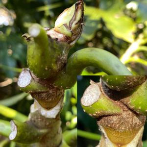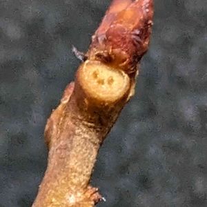 クイズ冬芽葉痕 蔓性の常緑低木です。 挿し木にしておいたら葉っぱが落ちてこんな可愛いお顔の子がいました。 球形の面白い実が着くこの子はどなたでしょうか。