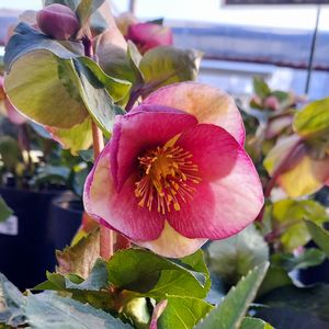 雨の中☔ クリスマスローズ グレンダグロス咲いています 再登場です 1/9upの時はもう少し濃いピンクでした 色も変わってきています。 まだ蕾も有って暫く楽しめそうです