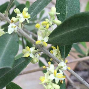 オリーブに黄色い花が咲きました! 植え付けて3年目で初めてです。 今年はほとんどの枝に花芽がついています。