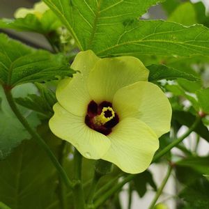 オクラの花 夏より少し花が小さくなりました。 でも存在感は変わりません❣️👍 そして美味しい丸オクラがみのります☺️
