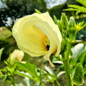 オクラの花&実💠🙆 アオイ科 トロロアオイ属 🏷️月曜日にビタミンカラー 🏷️ビタミン&ミネラル豊富!! 🏷️栄養価が高い 参加します 散歩🚶♀️より ハイビスカスに似たお花はレモンイエローでした (*σ´ェ`)σ実も沢山付いてます😂