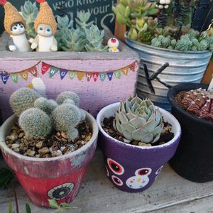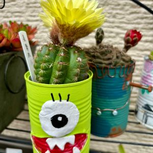 1️⃣ふうさんの妖怪リメ缶に植えたサボテンに花が咲きました🌼 頭に花が... 見てるとおかしくて吹き出してしまいそう🤣キャハハ〜 2️⃣上から観た図 🌼 後ろのフランケンも、もうすぐ咲きそう🤭💕