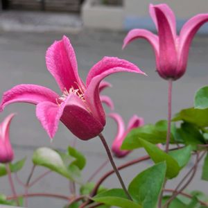 クレマチスのプリンセス・ダイアナ 夏のバッサリ剪定の後、二番花が咲き始めました😃 テッセン型のクレマチスしか知らなかった時にカタログでこれを見て感激した品種です😆🎵🎵 初夏は意外とうどん粉病が出てしまい、途中からボロボロになってしまいます😰