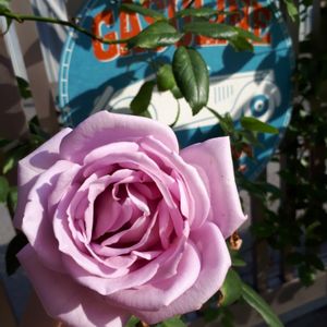 つるバラ ブルームーン🌹 青い空と💕お隣さんの屋根💕 のコラボが素晴らしい〜 とてもいい香り💕 我が家のファースト薔薇🌹 全ては、ここから始まった😂【狂ったと、夫は言う】
