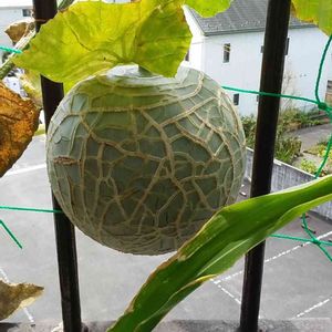 人工受粉が成功して大きくなったベランダdeメロン🍈 ソフトボールくらいになったので防虫と落下防止を兼ねて100均排水口ネットでカバー😉奥の方に見えるのはパッションフルーツです🥰