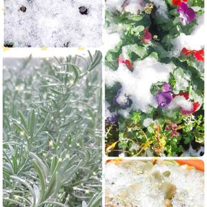 雪が降りました~❄️ 早朝に雪が降って、今は殆ど消えましたが✨😆 左上、チューリップ・グリーンキングとスプリングビュービューの鉢🌷 左下、フレンチラベンダー✨ 右上、ビオラのリース💓 右下、姫秀麗の葉挿し😅💦 皇帝ダリアは、問題なく咲いてますが…霜には弱いのでビミョーです😩